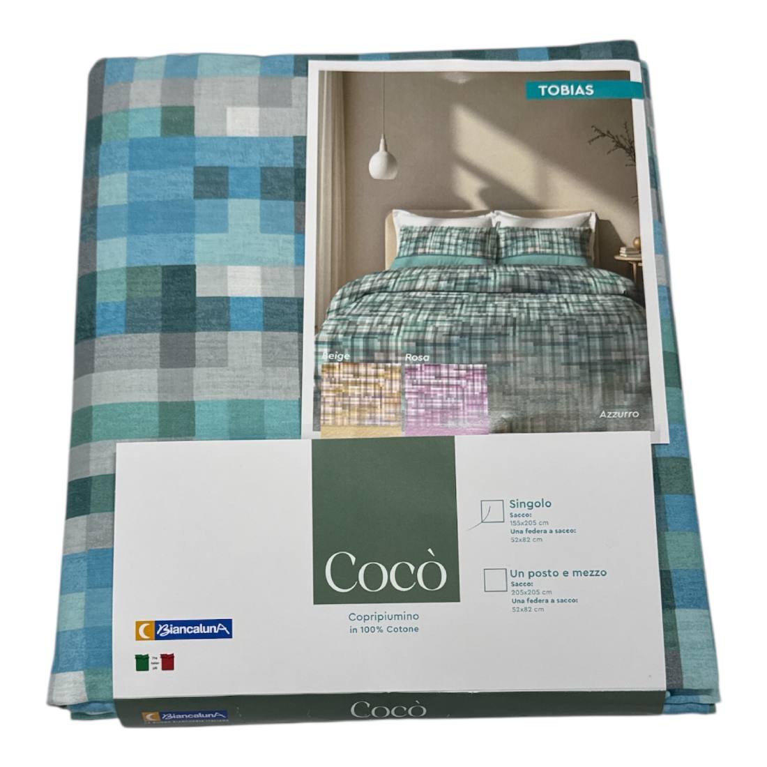 Nuovo Parure Copripiumino Biancaluna Tessuto Puro Cotone Tobias Celeste